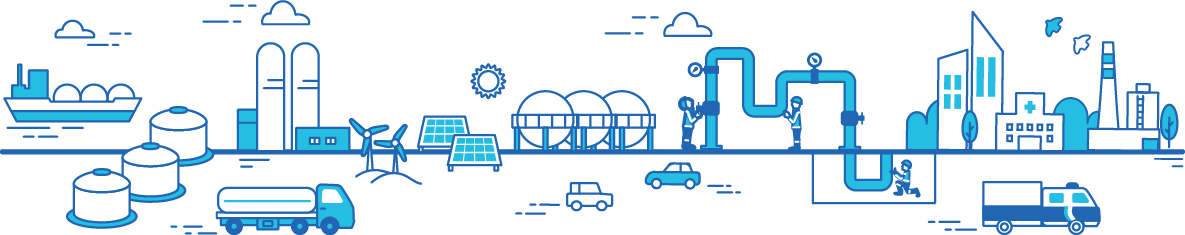 国内エネルギー事業では、ガス販売、ガス機器販売、ガス配管工事、熱供給、LPG販売、LNG販売、産業ガス販売、発電、電力供給などを行っています。