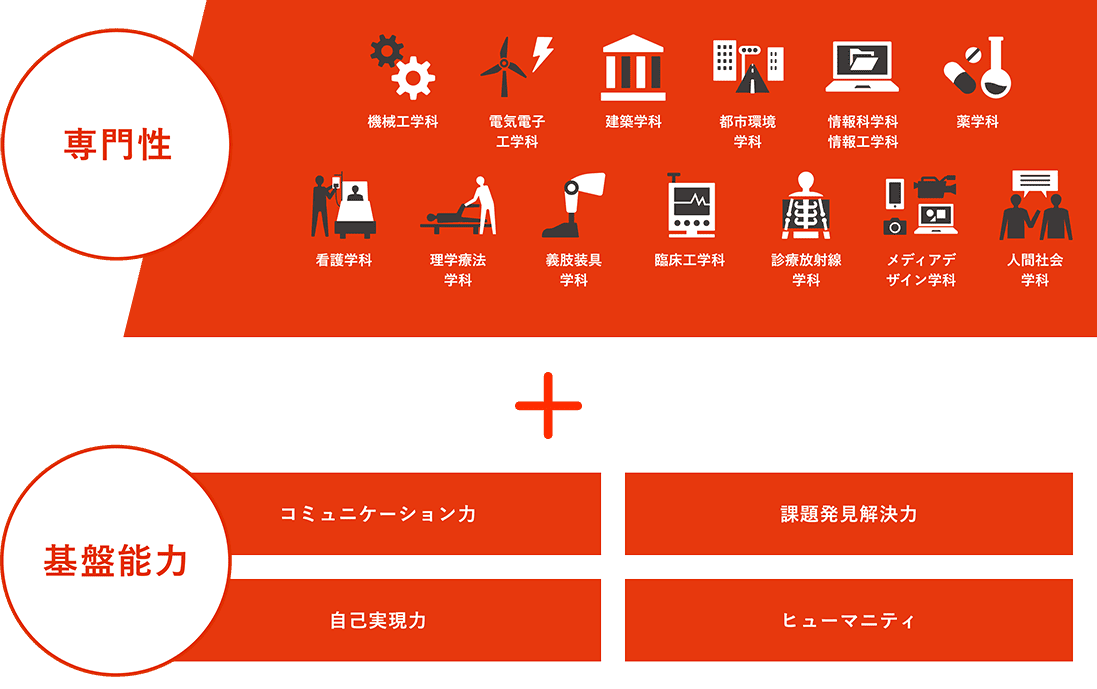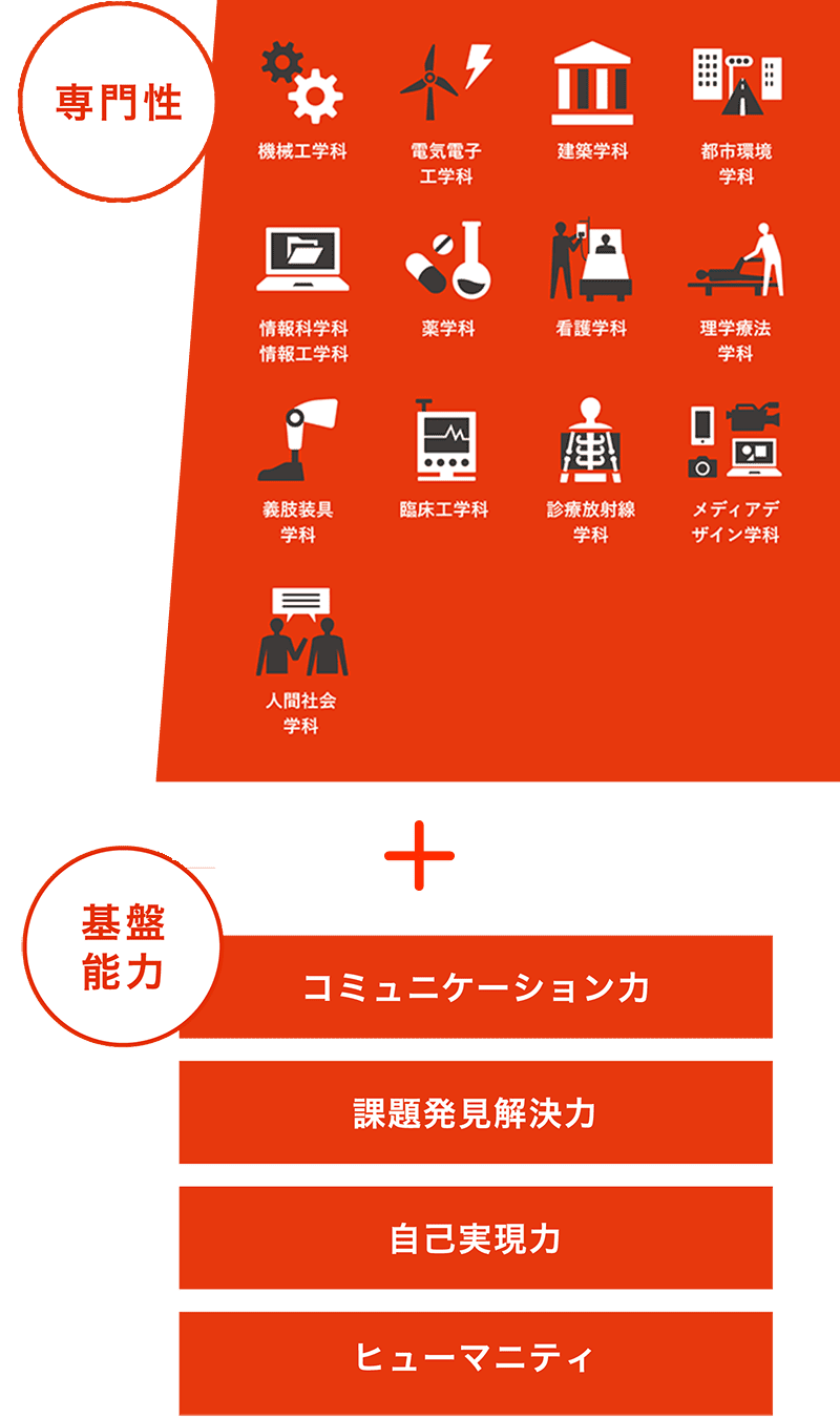 北海道科学大学は、学生の皆さんが専門性を身に付けるだけでなく、社会で求められるコミュニケーション力や課題発見解決力といった基盤能力を養うことを重視します。これらの能力を併せ持った人材が+Professionalです。