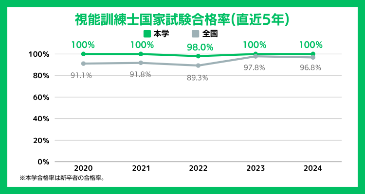 2014~2021年度まで、8年連続100%を達成、2023年度に引き続き2024年度も100%となりました。オリジナル模擬試験の実施、到達度ごとの学修指導など、少人数教育で一人ひとりの学生をサポートしています。