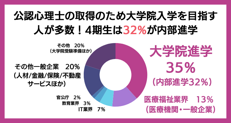 国際医療福祉大学の心理学科では、2026年3月卒業生の35%が大学院へ進学、内部進学率は32%となっています。
