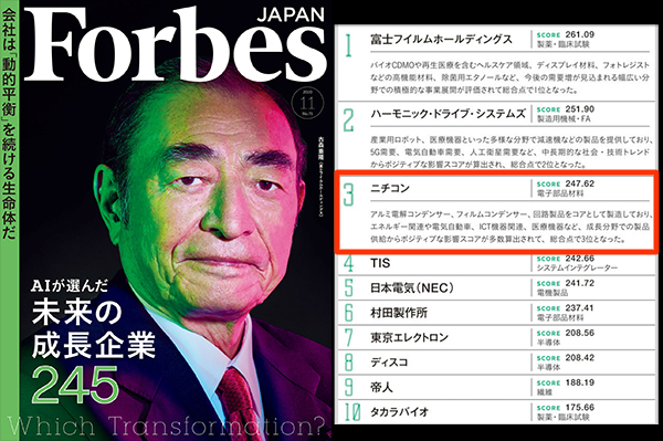 「AIが選んだ未来の成長企業245」にて、3位に選出されました( 『Forbes JAPAN』 11月号, 2020年)。エネルギー関連、電気自動車、ICT機器関連、医療機器など成長分野での製品供給を評価されています。